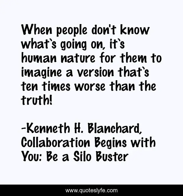This page presents the quote "When people don't know what’s going on, it’s human nature for them to imagine a version that’s ten times worse than the truth!". Author of this quote is Kenneth H. Blanchard, Collaboration Begins with You: Be a Silo Buster. This quote is about human-nature, collaboration, leadership, truth, imagine,.
