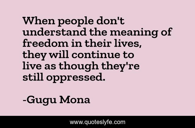 This page presents the quote "When people don't understand the meaning of freedom in their lives, they will continue to live as though they're still oppressed.". Author of this quote is Gugu Mona. This quote is about people, freedom, oppressed, live, meaning, lives, understand,.