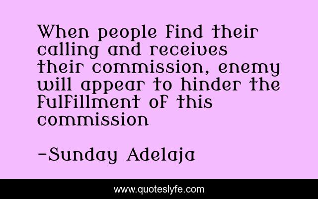 This page presents the quote "When people find their calling and receives their commission, enemy will appear to hinder the fulfillment of this commission". Author of this quote is Sunday Adelaja. This quote is about calling, commission, fulfillment, goals, hindrance, purpose,.