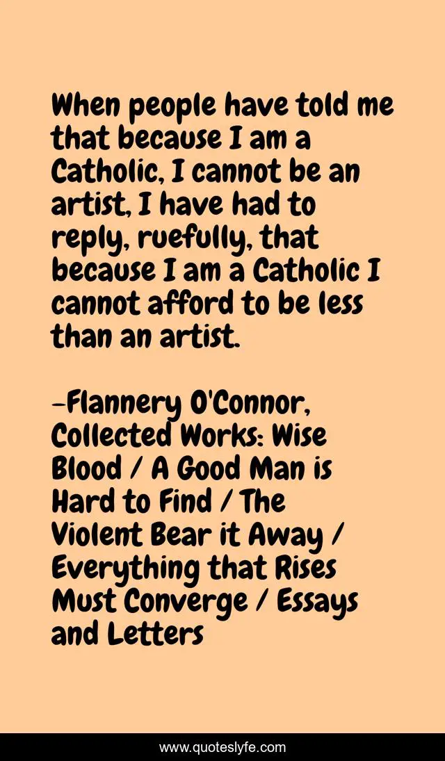 This page presents the quote "When people have told me that because I am a Catholic, I cannot be an artist, I have had to reply, ruefully, that because I am a Catholic I cannot afford to be less than an artist.". Author of this quote is Flannery O'Connor, Collected Works: Wise Blood / A Good Man is Hard to Find / The Violent Bear it Away / Everything that Rises Must Converge / Essays and Letters. This quote is about catholic, writers, art, artist,.