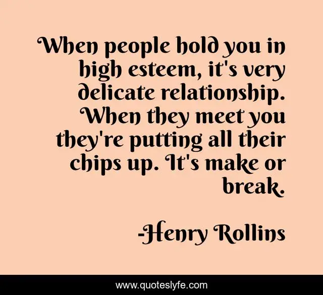 This page presents the quote "When people hold you in high esteem, it's very delicate relationship. When they meet you they're putting all their chips up. It's make or break.". Author of this quote is Henry Rollins. This quote is about hold, people,.