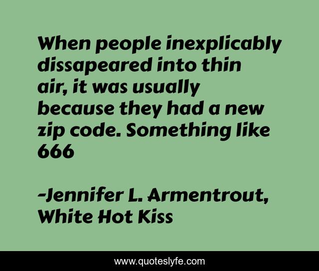 This page presents the quote "When people inexplicably dissapeared into thin air, it was usually because they had a new zip code. Something like 666". Author of this quote is Jennifer L. Armentrout, White Hot Kiss. This quote is about hell, white-hot-kiss,.
