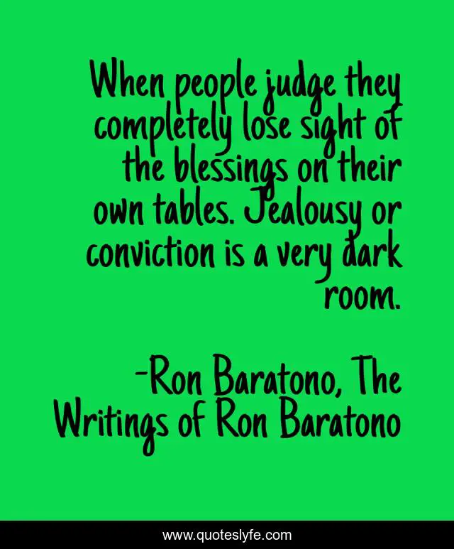 This page presents the quote "When people judge they completely lose sight of the blessings on their own tables. Jealousy or conviction is a very dark room.". Author of this quote is Ron Baratono, The Writings of Ron Baratono. This quote is about darkness, conviction, people, blessing, jealousy, judgment,.