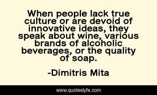 This page presents the quote "When people lack true culture or are devoid of innovative ideas, they speak about wine, various brands of alcoholic beverages, or the quality of soap.". Author of this quote is Dimitris Mita. This quote is about culture, idiots, snobs, weak-souls,.