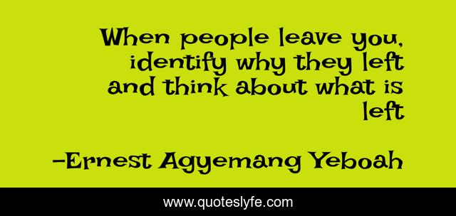 This page presents the quote "When people leave you, identify why they left and think about what is left". Author of this quote is Ernest Agyemang Yeboah. This quote is about life, death, depature, loneliness-of-life, positive, loneliness, motivational, when-people-leave-you, wisdom,.