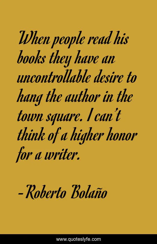 This page presents the quote "When people read his books they have an uncontrollable desire to hang the author in the town square. I can’t think of a higher honor for a writer.". Author of this quote is Roberto Bolaño. This quote is about public-opinion, writing,.