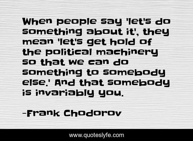 This page presents the quote "When people say 'let's do something about it', they mean 'let's get hold of the political machinery so that we can do something to somebody else.' And that somebody is invariably you.". Author of this quote is Frank Chodorov. This quote is about collectivism, government, ancap, freedom, taxation, statism, non-aggression-principle, liberty, anarchy,.