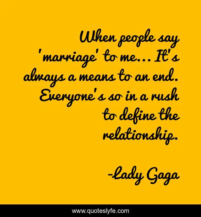 This page presents the quote "When people say 'marriage' to me... It's always a means to an end. Everyone's so in a rush to define the relationship.". Author of this quote is Lady Gaga. This quote is about me, relationship, people,.