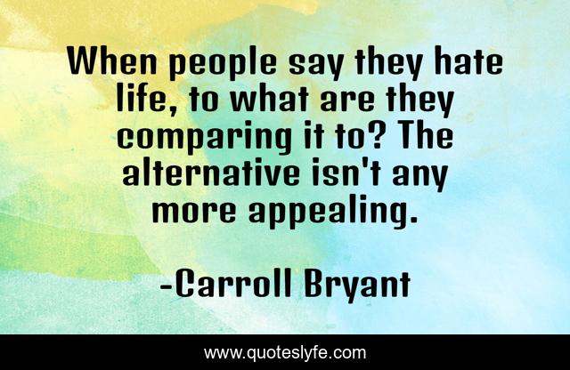This page presents the quote "When people say they hate life, to what are they comparing it to? The alternative isn't any more appealing.". Author of this quote is Carroll Bryant. This quote is about philisophical, philosophy-of-life, philsophical-thought, philosphy,.