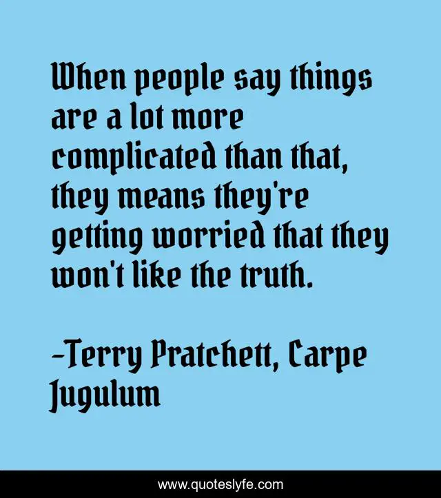 This page presents the quote "When people say things are a lot more complicated than that, they means they're getting worried that they won't like the truth.". Author of this quote is Terry Pratchett, Carpe Jugulum. .