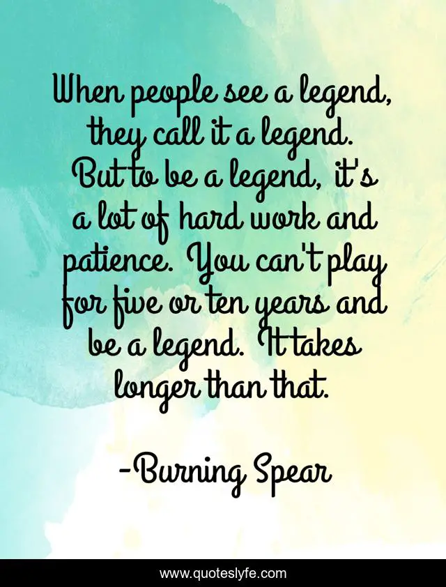 This page presents the quote "When people see a legend, they call it a legend. But to be a legend, it's a lot of hard work and patience. You can't play for five or ten years and be a legend. It takes longer than that.". Author of this quote is Burning Spear. This quote is about work, hard work, people,.