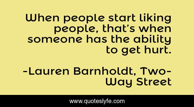This page presents the quote "When people start liking people, that’s when someone has the ability to get hurt.". Author of this quote is Lauren Barnholdt, Two-Way Street. This quote is about life, life-lessons, reality,.