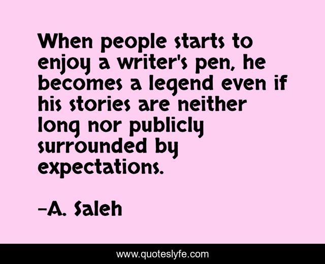 This page presents the quote "When people starts to enjoy a writer's pen, he becomes a legend even if his stories are neither long nor publicly surrounded by expectations.". Author of this quote is A. Saleh. This quote is about pen, writer, legend, expectations, people,.