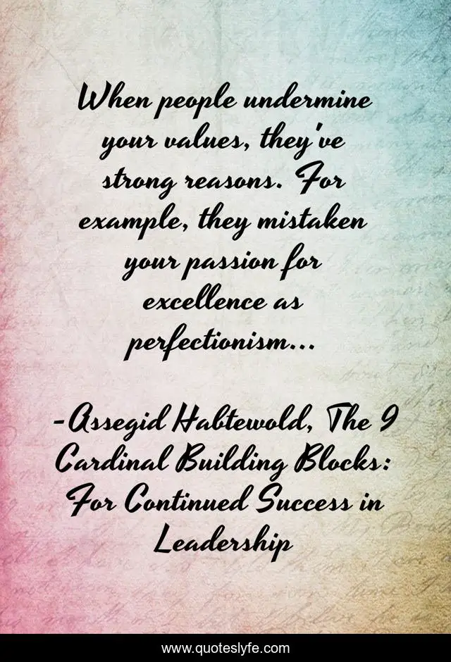 This page presents the quote "When people undermine your values, they've strong reasons. For example, they mistaken your passion for excellence as perfectionism...". Author of this quote is Assegid Habtewold, The 9 Cardinal Building Blocks: For Continued Success in Leadership. This quote is about perfectionism, pro-leadership, excellence, values, success-pathways, assegid-habtewold,.