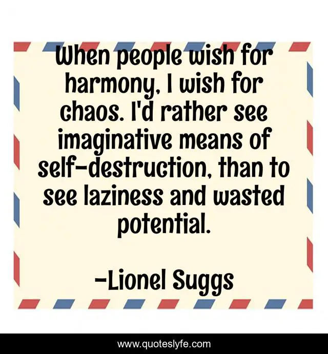 This page presents the quote "When people wish for harmony, I wish for chaos. I'd rather see imaginative means of self-destruction, than to see laziness and wasted potential.". Author of this quote is Lionel Suggs. .