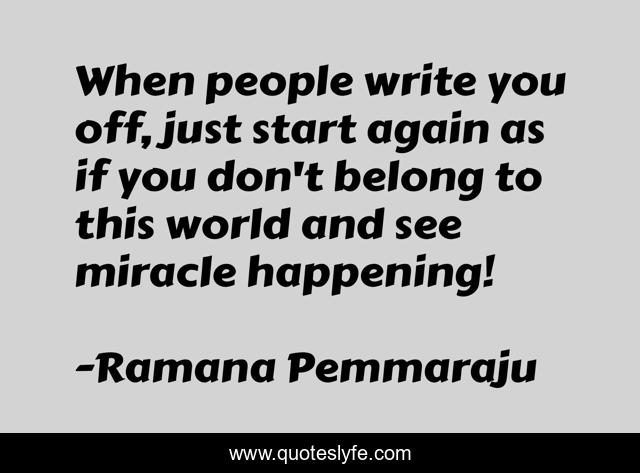 This page presents the quote "When people write you off, just start again as if you don't belong to this world and see miracle happening!". Author of this quote is Ramana Pemmaraju. This quote is about miracles, confidence, intelligence, mind, depression, inspirational, world, enthusiasm, lack-of-confidence,.