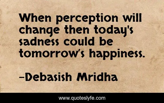 This page presents the quote "When perception will change then today's sadness could be tomorrow’s happiness.". Author of this quote is Debasish Mridha. This quote is about life, perception, love, knowledge, inspirational, intelligence, philosophy, wisdom, sadness,.