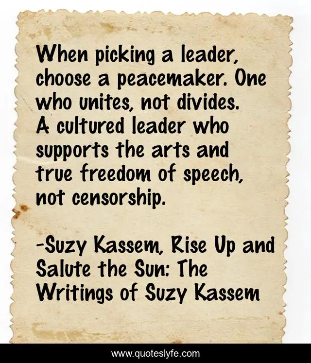 "Suzy Kassem, Rise Up and Salute the Sun: The Writings of Suzy Kassem Quotes." Quoteslyfe.com, 2025. Fri. 05 Dec. 2025. <https://www.quoteslyfe.com/quote/When-picking-a-leader-choose-a-peacemaker-55203>.