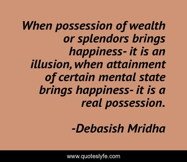This page presents the quote "When possession of wealth or splendors brings happiness- it is an illusion, when attainment of certain mental state brings happiness- it is a real possession.". Author of this quote is Debasish Mridha. This quote is about possession, life, love, knowledge, inspirational, intelligence, philosophy, mind, wisdom,.
