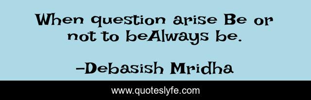 This page presents the quote "When question arise Be or not to beAlways be.". Author of this quote is Debasish Mridha. This quote is about life, love, knowledge, inspirational, intelligence, philosophy, wisdom, quotes, affection,.