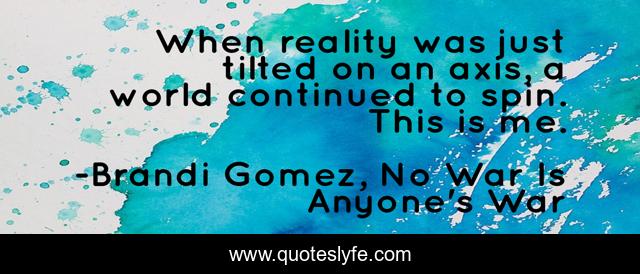 This page presents the quote "When reality was just tilted on an axis, a world continued to spin. This is me.". Author of this quote is Brandi Gomez, No War Is Anyone's War. This quote is about world, brandi-gomez, reality,.