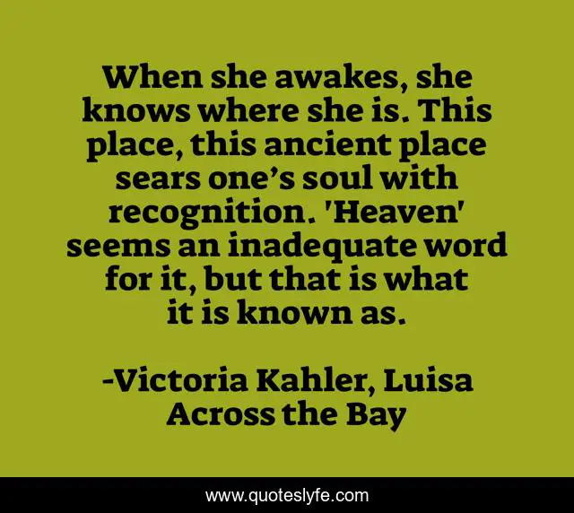 This page presents the quote "When she awakes, she knows where she is. This place, this ancient place sears one’s soul with recognition. 'Heaven' seems an inadequate word for it, but that is what it is known as.". Author of this quote is Victoria Kahler, Luisa Across the Bay. This quote is about eternity, death, dying, afterlife, soul, heaven,.