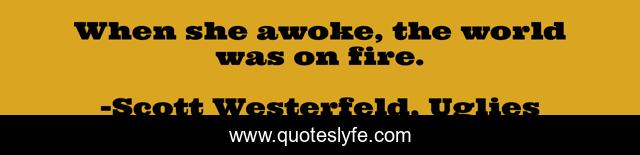 This page presents the quote "When she awoke, the world was on fire.". Author of this quote is Scott Westerfeld, Uglies. This quote is about shay, full-metal-alchemist, fire, tally, uglies, ugly, avatar, awoke, naruto,.
