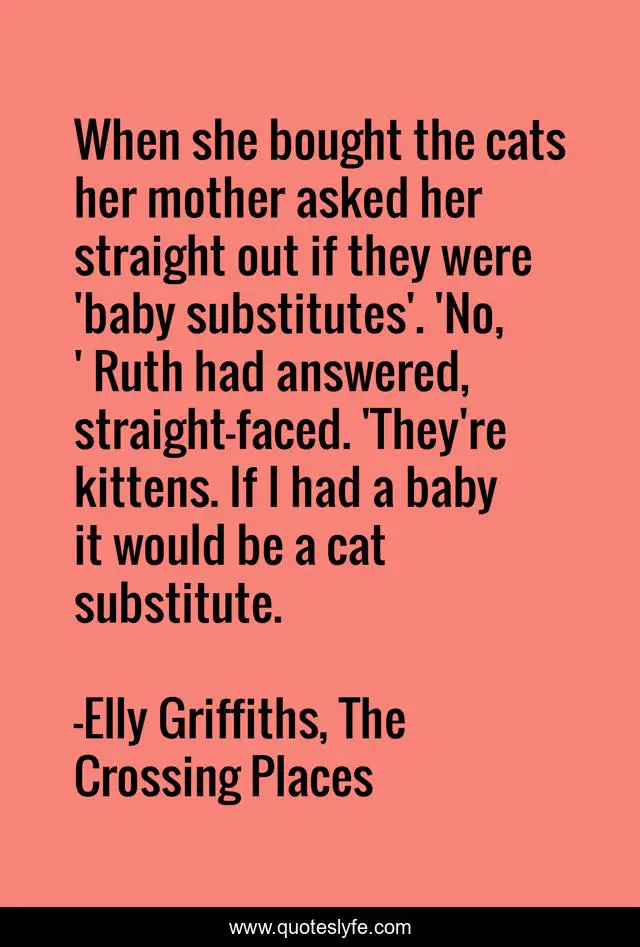 This page presents the quote "When she bought the cats her mother asked her straight out if they were 'baby substitutes'. 'No, ' Ruth had answered, straight-faced. 'They're kittens. If I had a baby it would be a cat substitute.". Author of this quote is Elly Griffiths, The Crossing Places. This quote is about cats, elly-griffiths, ruth-galloway,.