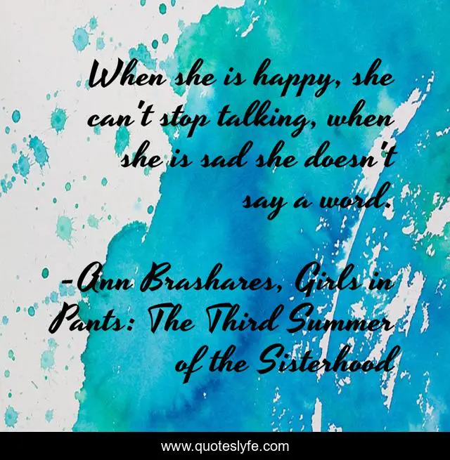 This page presents the quote "When she is happy, she can't stop talking, when she is sad she doesn't say a word.". Author of this quote is Ann Brashares, Girls in Pants: The Third Summer of the Sisterhood. .