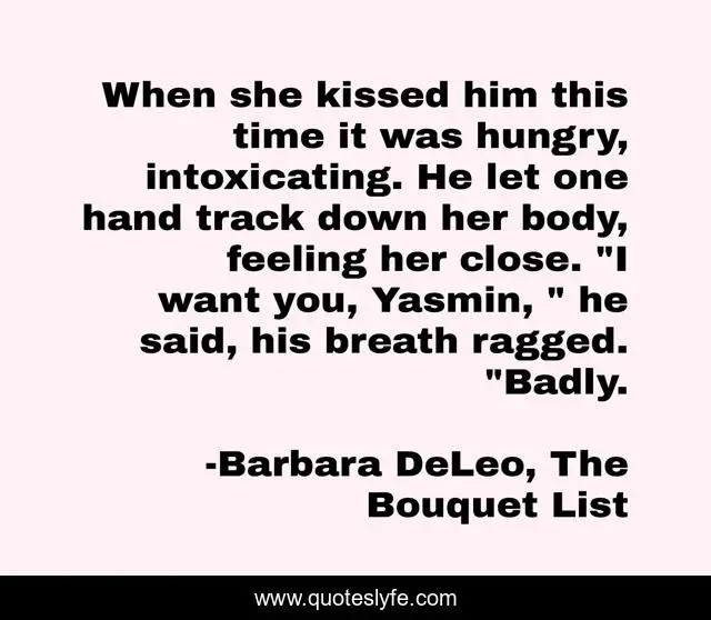 This page presents the quote "When she kissed him this time it was hungry, intoxicating. He let one hand track down her body, feeling her close. "I want you, Yasmin, " he said, his breath ragged. "Badly.". Author of this quote is Barbara DeLeo, The Bouquet List. .