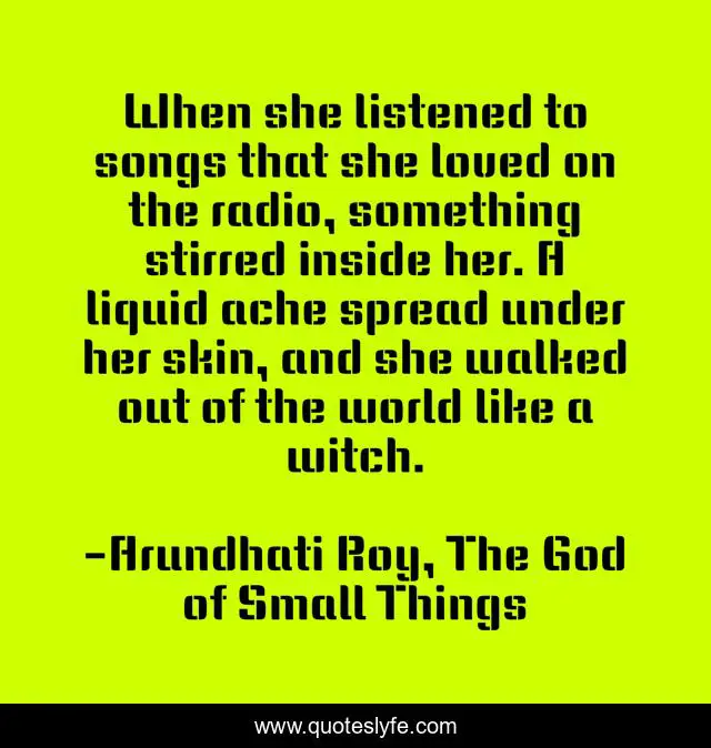 This page presents the quote "When she listened to songs that she loved on the radio, something stirred inside her. A liquid ache spread under her skin, and she walked out of the world like a witch.". Author of this quote is Arundhati Roy, The God of Small Things. This quote is about beautiful, music, witch, inspirational, enthusiasm,.