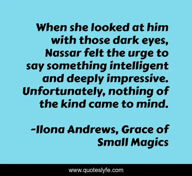 This page presents the quote "When she looked at him with those dark eyes, Nassar felt the urge to say something intelligent and deeply impressive. Unfortunately, nothing of the kind came to mind.". Author of this quote is Ilona Andrews, Grace of Small Magics. This quote is about romance, funny, flirting, humor, comedy,.