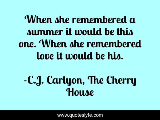 This page presents the quote "When she remembered a summer it would be this one. When she remembered love it would be his.". Author of this quote is C.J. Carlyon, The Cherry House. This quote is about true-love, summer, love, remember, memories, first-love, romance, summer-love, affection,.