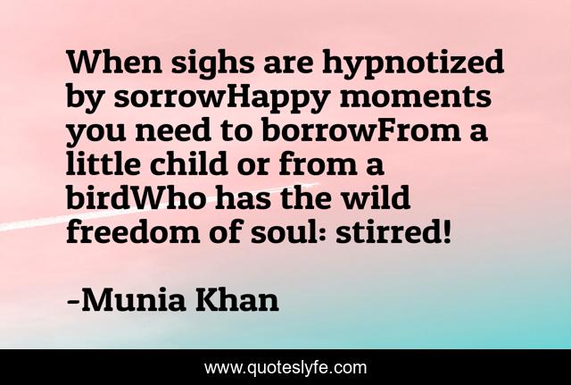 This page presents the quote "When sighs are hypnotized by sorrowHappy moments you need to borrowFrom a little child or from a birdWho has the wild freedom of soul: stirred!". Author of this quote is Munia Khan. This quote is about poem, stirred, hypnotize, moments, freedom, sorrow, poetry, soul, sighs,.