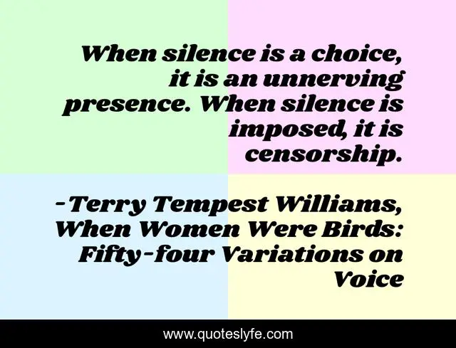 This page presents the quote "When silence is a choice, it is an unnerving presence. When silence is imposed, it is censorship.". Author of this quote is Terry Tempest Williams, When Women Were Birds: Fifty-four Variations on Voice. This quote is about voice, censor, censorship, silence,.