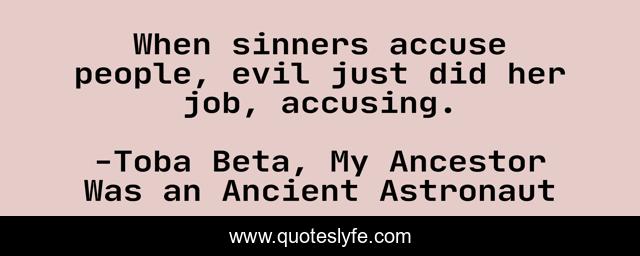 This page presents the quote "When sinners accuse people, evil just did her job, accusing.". Author of this quote is Toba Beta, My Ancestor Was an Ancient Astronaut. This quote is about men, accuser, evil, sin,.