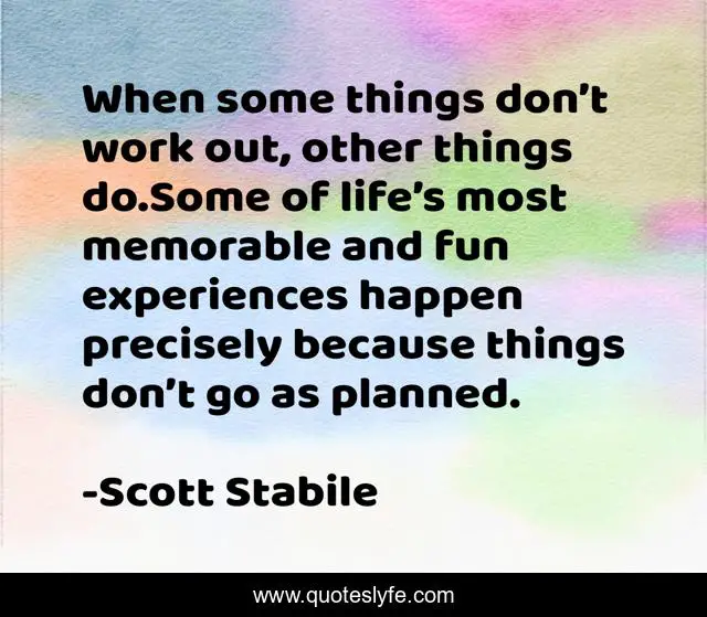 This page presents the quote "When some things don’t work out, other things do.Some of life’s most memorable and fun experiences happen precisely because things don’t go as planned.". Author of this quote is Scott Stabile. This quote is about life, motivation, truth, fun, happiness, inspiration,.