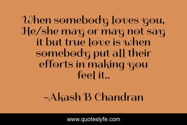 This page presents the quote "When somebody loves you, He/she may or may not say it but true love is when somebody put all their efforts in making you feel it..". Author of this quote is Akash B Chandran. This quote is about feel, true-love, efforts, love, affection,.