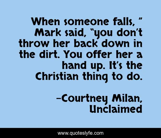 This page presents the quote "When someone falls, ” Mark said, “you don’t throw her back down in the dirt. You offer her a hand up. It’s the Christian thing to do.". Author of this quote is Courtney Milan, Unclaimed. .