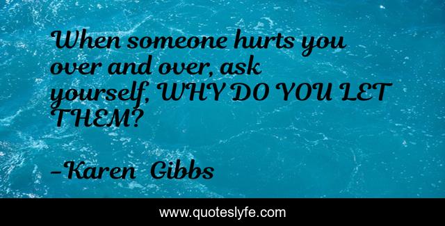 This page presents the quote "When someone hurts you over and over, ask yourself, WHY DO YOU LET THEM?". Author of this quote is Karen Gibbs. This quote is about confidence, relationship, positive, motivational, optimistic, life-lessons, hurts, family-drama, life-and-living,.