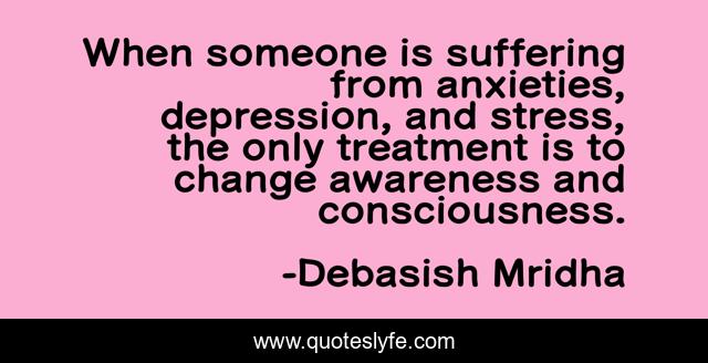 This page presents the quote "When someone is suffering from anxieties, depression, and stress, the only treatment is to change awareness and consciousness.". Author of this quote is Debasish Mridha. This quote is about anxiety, anxieties, treatment-of-depression, philosophy, debasish-mridha, quotes, inspirational, enthusiasm, debasish-mridha-m-d,.