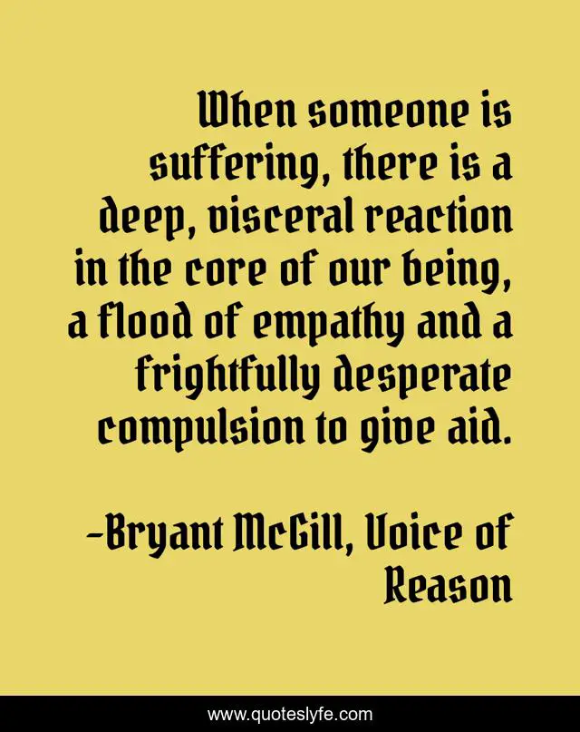 This page presents the quote "When someone is suffering, there is a deep, visceral reaction in the core of our being, a flood of empathy and a frightfully desperate compulsion to give aid.". Author of this quote is Bryant McGill, Voice of Reason. This quote is about suffering, empathy, help, care, giving-help,.