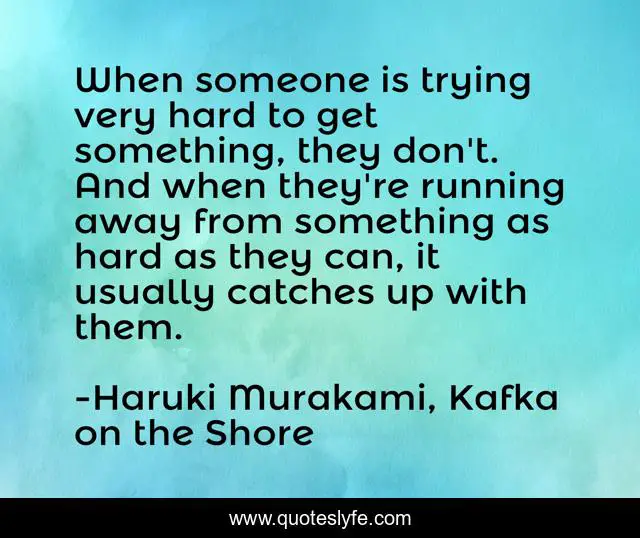 This page presents the quote "When someone is trying very hard to get something, they don't. And when they're running away from something as hard as they can, it usually catches up with them.". Author of this quote is Haruki Murakami, Kafka on the Shore. This quote is about enthusiasm, inspirational,.