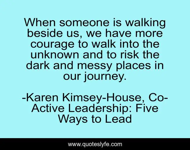 This page presents the quote "When someone is walking beside us, we have more courage to walk into the unknown and to risk the dark and messy places in our journey.". Author of this quote is Karen Kimsey-House, Co-Active Leadership: Five Ways to Lead. This quote is about walking, risk, unknown, connections, courage, leadership, self-help, messy, journey,.
