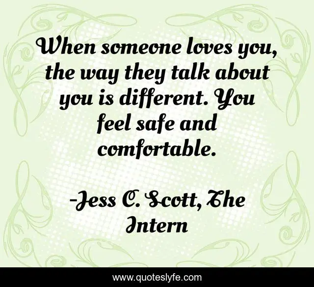 This page presents the quote "When someone loves you, the way they talk about you is different. You feel safe and comfortable.". Author of this quote is Jess C. Scott, The Intern. This quote is about desire, emotion, individuality, love, honesty, relationships, life, reality, romance,.