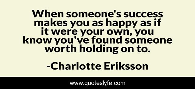 This page presents the quote "When someone's success makes you as happy as if it were your own, you know you've found someone worth holding on to.". Author of this quote is Charlotte Eriksson. This quote is about realisation, two-people, kind, love, success, relationship, friendship, together, growth,.