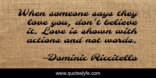 This page presents the quote "When someone says they love you, don’t believe it. Love is shown with actions and not words.". Author of this quote is Dominic Riccitello. This quote is about true-love, life, falling-in-love, love, quote, actions, perspective, thoughts, opinion,.