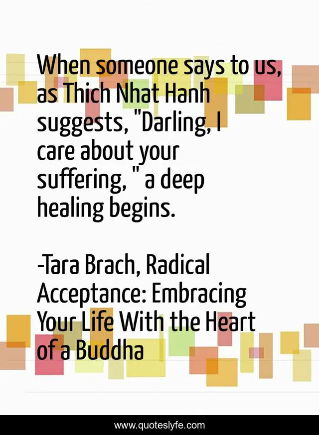 This page presents the quote "When someone says to us, as Thich Nhat Hanh suggests, "Darling, I care about your suffering, " a deep healing begins.". Author of this quote is Tara Brach, Radical Acceptance: Embracing Your Life With the Heart of a Buddha. This quote is about suffering, empathy, healing, care,.