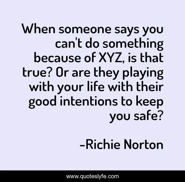 This page presents the quote "When someone says you can't do something because of XYZ, is that true? Or are they playing with your life with their good intentions to keep you safe?". Author of this quote is Richie Norton. This quote is about confidence, self-mastery, mindful, marketing, work, success, self-help, entrepreneur, innovation,.