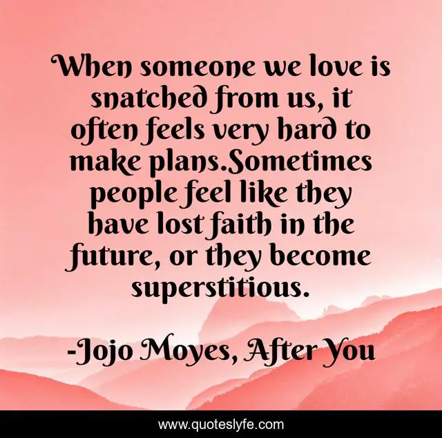 This page presents the quote "When someone we love is snatched from us, it often feels very hard to make plans.Sometimes people feel like they have lost faith in the future, or they become superstitious.". Author of this quote is Jojo Moyes, After You. This quote is about faith, lost, me-before-you, jojo-moyes, grief, after-you,.